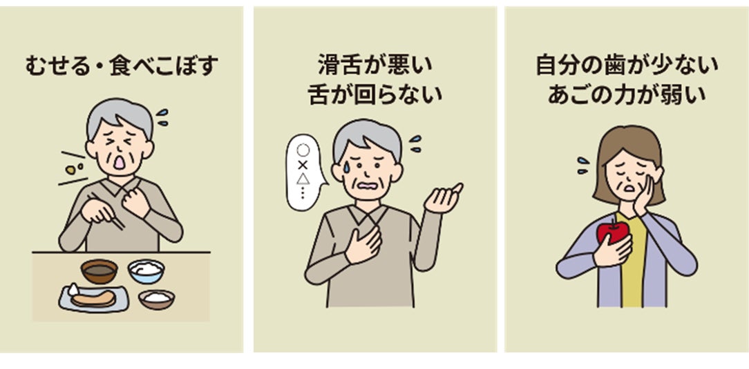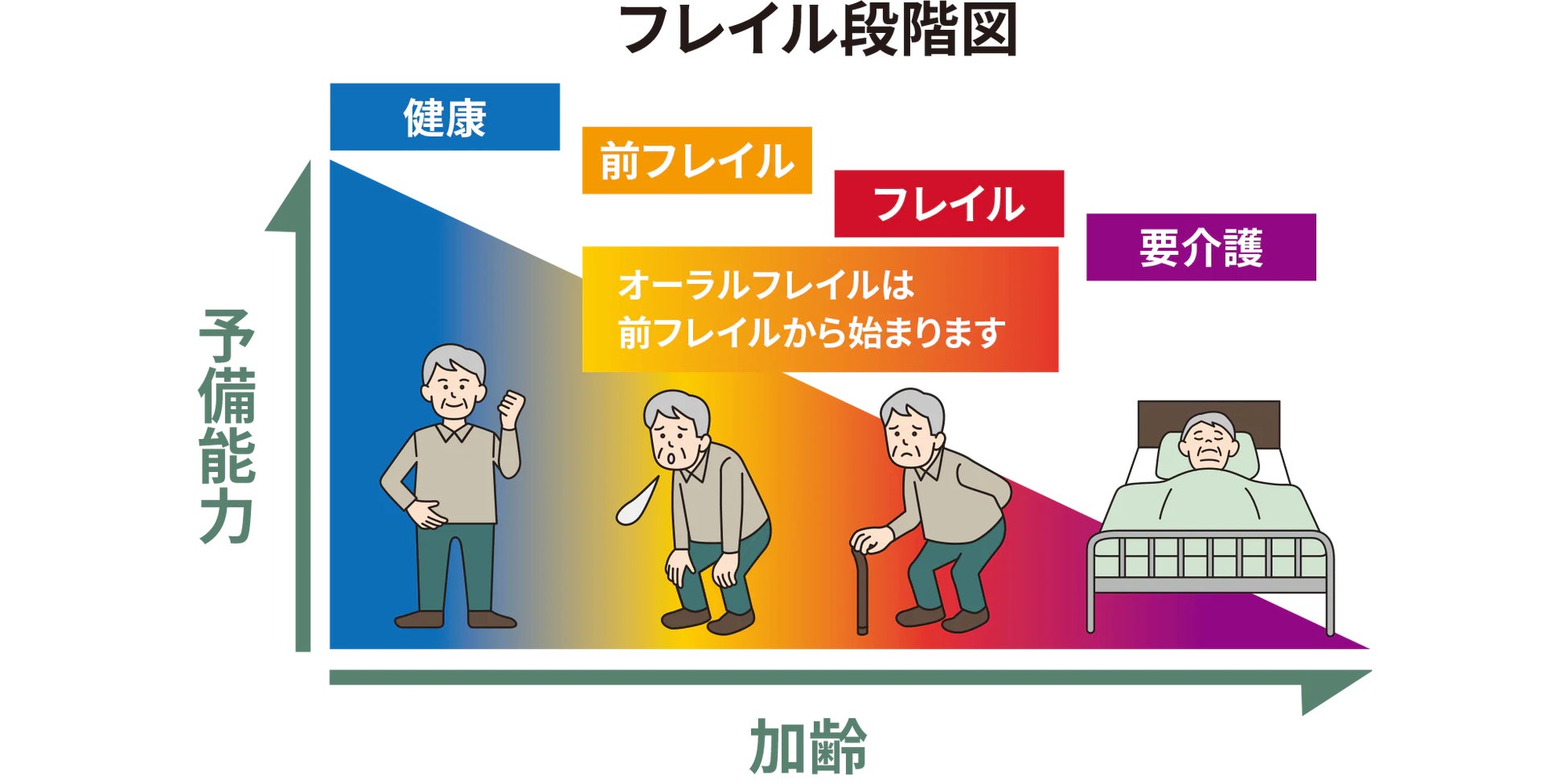 それら症状は歯科領域で「オーラルフレイル」として問題視されはじめ、「口腔機能低下症」という病名で健康保険が適用され(65歳以上、2018年)、さらにその後、早期発見・早期対処のために50歳以上に適用年齢が拡大されました(2022年)。