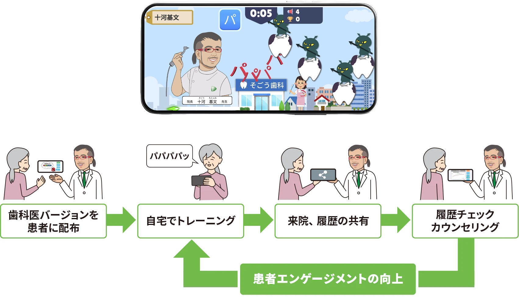連続発声によるコンボ技発動、スコアのランキング表示、プレイ履歴の記録など、ゲームとしての面白さ・ヤリ込み要素を盛り込んで、高齢者や子どもたちが“ゲームで遊んでいたら知らないうちにお口のトレーニングができていた”と感じるようなシリアスゲーム※であり、一定期間アプリの利用がない場合は注意喚起し、発声回数が一定値を下回れば歯科医院への受診を促すヘルスケアアプリでもあります。