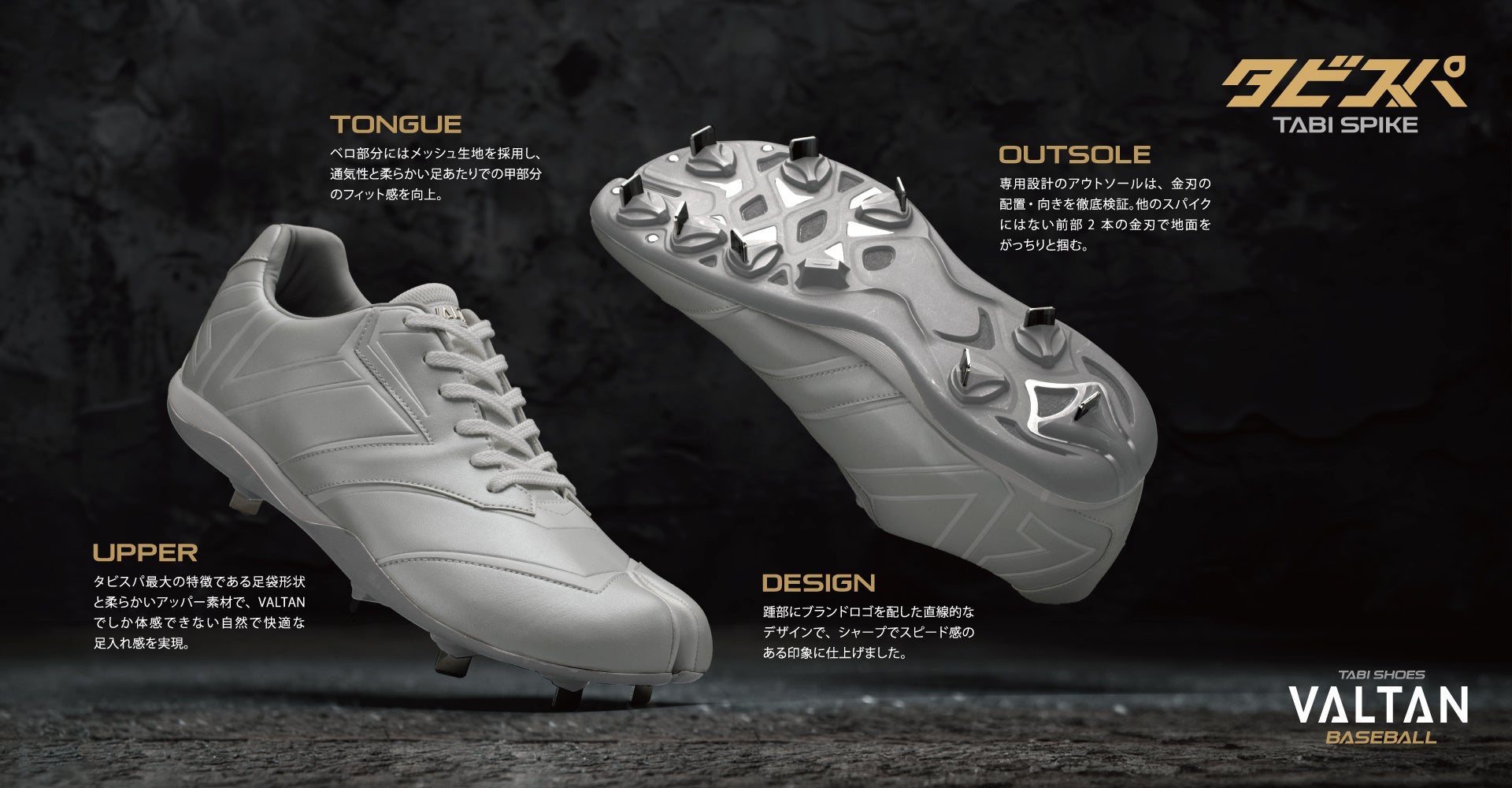 そして、培ってきた靴づくりの技術と足袋シューズのノウハウを基に昨年より、アスリートの「足を護り、パフォーマンス向上に寄与する」ため新たなオリジナルブランドとして足袋スポーツシューズ『VALTAN』をスタート。現在、競技用用足袋シューズとして、昨年8月発売の足袋ゴルフシューズ、そして今回発売の足袋野球スパイクを展開しています。