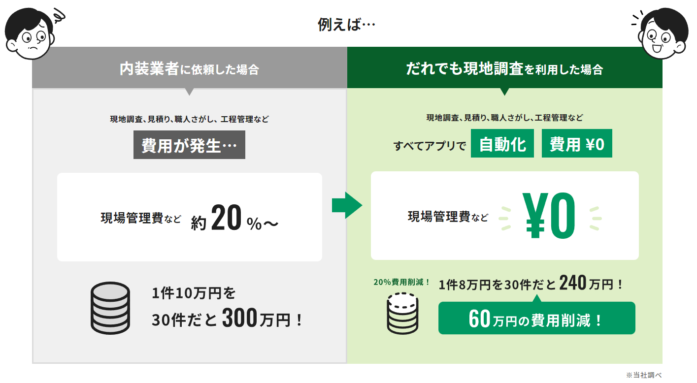 アプリを使って現地調査をすれば、あとはシステムで見積作成を行い、職人さがしや工程管理までを自動で行うことができるため、コストを大幅に削減することができます。