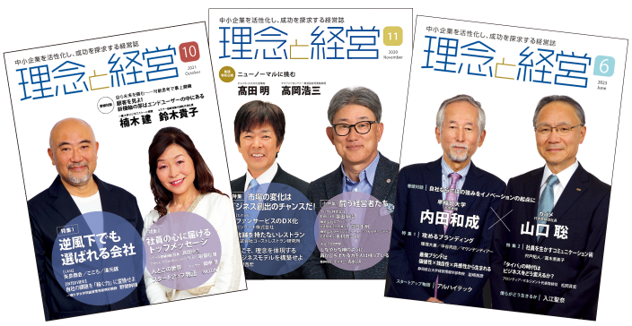 月刊『理念と経営』は、全国の中小企業で働く皆様のお役に立ちたいという願いを込め2006年1月に創刊しました。「経営・教養・感動」をテーマに多数の企業事例を掲載し、逆境の先に見えるものに着眼した記事の中には感動的な内容も多く含まれています。個人の教養を深め知見を広げるだけでなく、社内や経営者同士の勉強会などに活用でき、それぞれの学びを支援しています。成功を探求する経営誌として、立場も業種も問わず幅広く分かりやすく共に学べる経営誌として、幅広くご愛読いただいています。