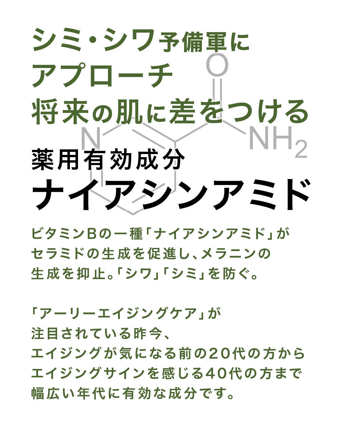 今現在はそこまでエイジングが表面化していない20代~30代の肌にも、紫外線や年齢によるシミ・シワの予備軍が眠っているので、表面化する前に予防しておくことが大事。