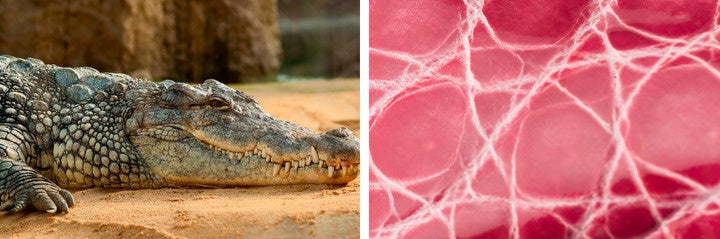 使用しているのは、背の部分でカットし、腹部を生かしたナイルクロコダイルの革です。竹の節のような「竹斑」から、丸い「丸斑(玉斑)」への変化が滑らかで、竹斑部分が多いのもナイルクロコダイルの特長です。