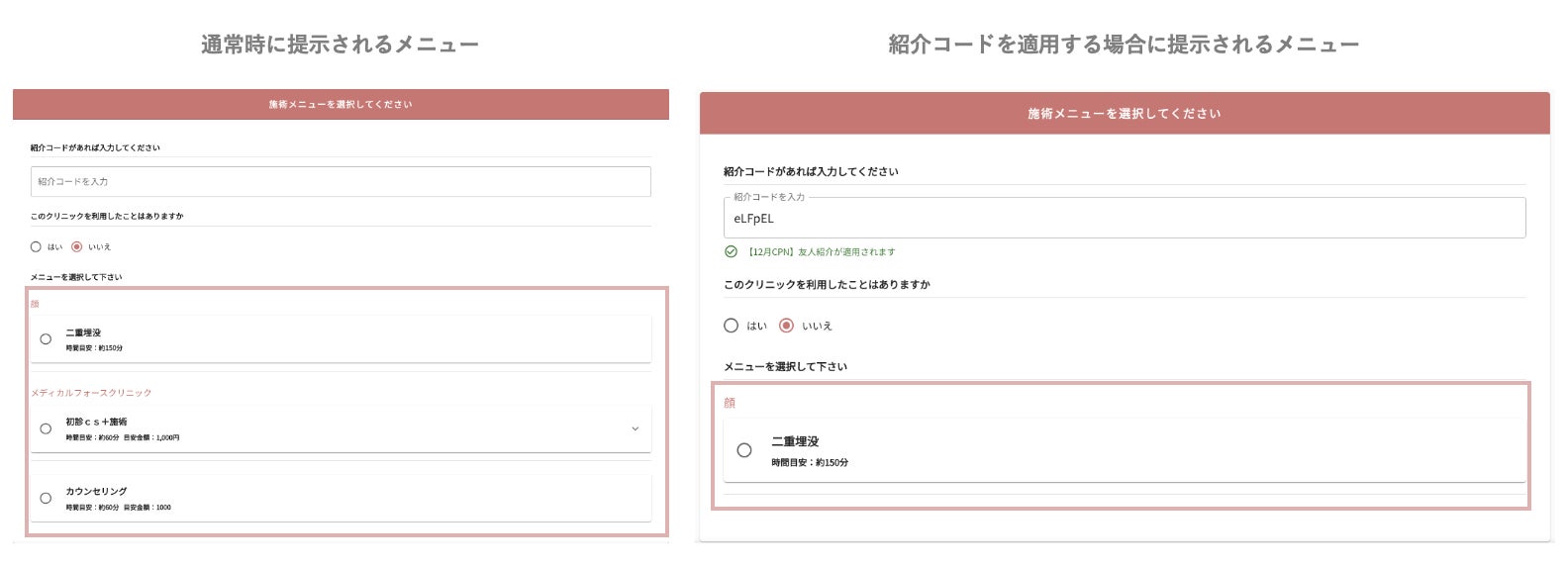 WEB予約時に、紹介経由で予約をする方と通常の予約をする方で選択できるメニューを出し分けることが可能です。