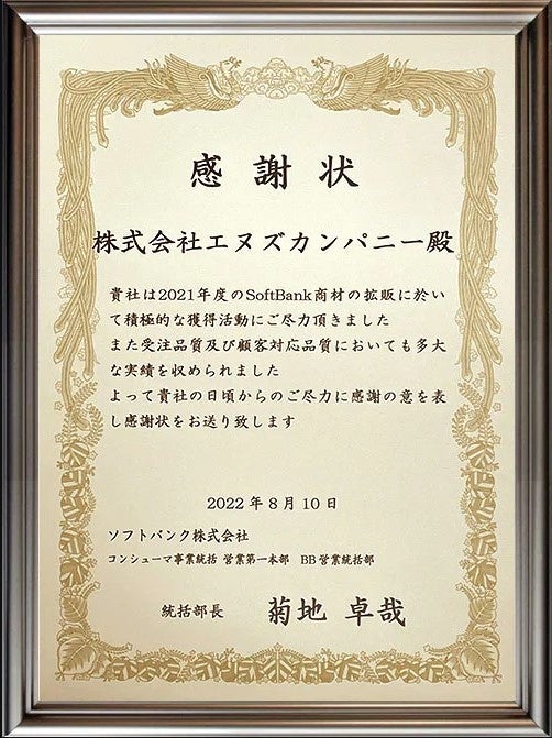 「SoftBank光・Air」正規代理店 エヌズカンパニー ソフトバンク(株)より【6年連続感謝状】受賞のお知らせ