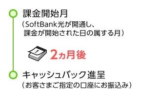 他社では開通6ヵ月後や12ヵ月後のキャッシュバック進呈などもございますが、当社では、課金開始月の翌々月末をめどに指定口座へお振り込みいたします(例:課金開始月が1月なら3月末振込)。