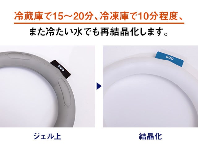 SUO リングは28℃の気温でPCM素材が変化するように成分を調整し、一般家庭でもお使いいただけやすい温度や性能に設計しています。28℃以下の温度で自然に、冷蔵庫で15~20分、冷凍庫で10分程度で結晶化し何度でも優しい冷却効果を得ることができます。また冷たい水でも結晶化します。