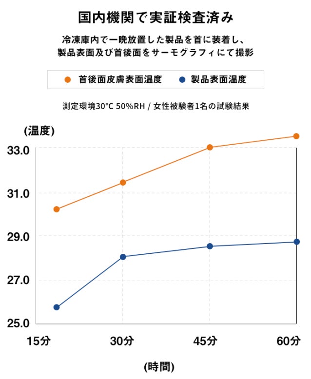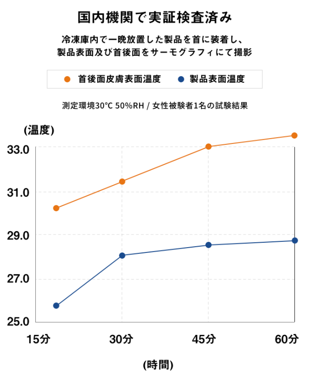 着用時と未着用時の首周りの温度変化を比較した所、60分後でも概ね体温よりマイナス5度台をキープするという結果になりました。