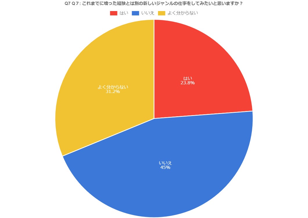 23.8%がこれまでの経験とは異なる新しいジャンルの仕事をしてみたいと回答しました。しかし、45%は異なるジャンルの仕事に興味がないと答え、31.2%が決断できないとしており、日本においてキャリア変更に対する意欲は分かれていることを示しています。