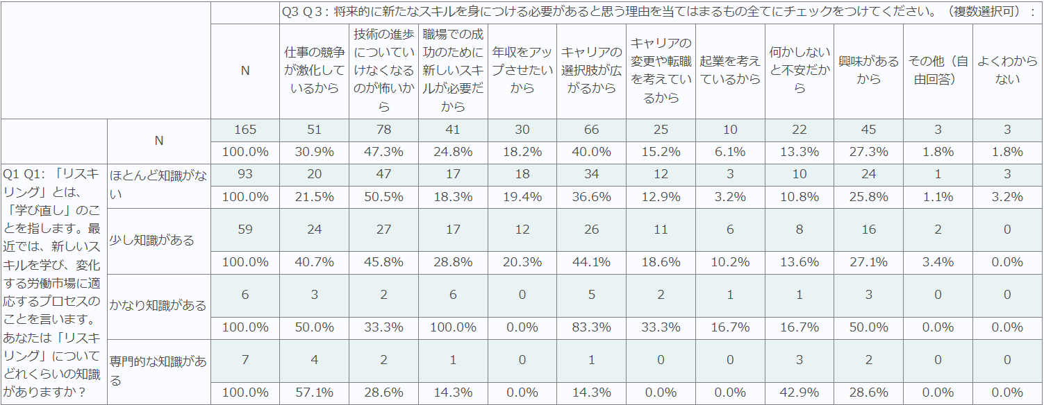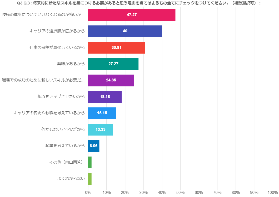Q3:(Q2で「リスキリングが重要だと思う」と回答した方への設問「将来的に新たなスキルを身につける必要があると思う理由を当てはまるもの全てにチェックをつけてください。」(複数選択可、n=165)