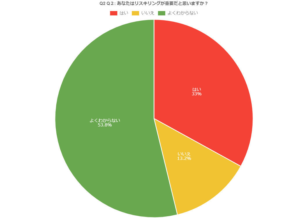 リスキリングの重要性については、33%が重要だと思う一方で、53.8%はよくわからないと回答しています。Q1でリスキリングに関する知識があると回答した人が全体の2割程度のみであ