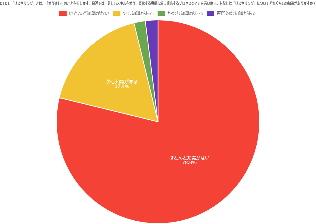 Q1:「リスキリング」とは、「学び直し」のことを指します。最近では、新しいスキルを学び、変化する労働市場に適応するプロセスのことを言います。あなたは「リスキリング」についてどれくらいの知識がありますか?」(n=500)