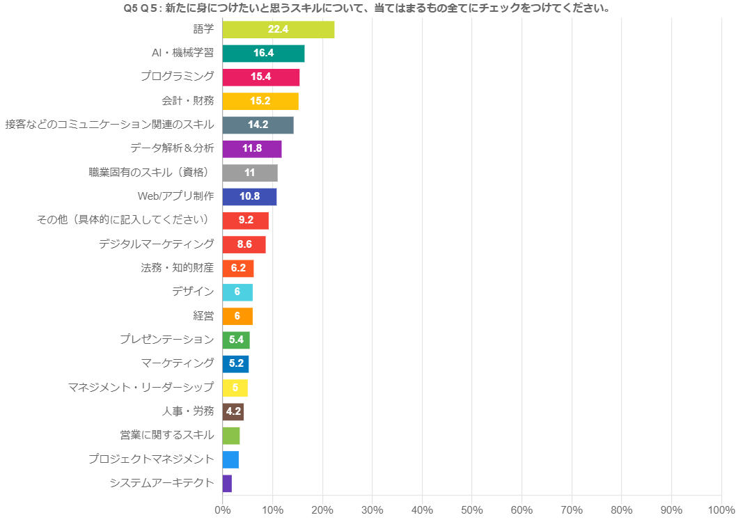 ●新たに身につけたいスキルとして、「語学」を選ぶ人が最も多く、続いて「AI・機械学習」、「プログラミング」、「会計・財務」などと続いた。特定の分野への極端な偏りは見られず、語学、ITスキル、専門スキル、と求めているスキルの分野はそれぞれだった。