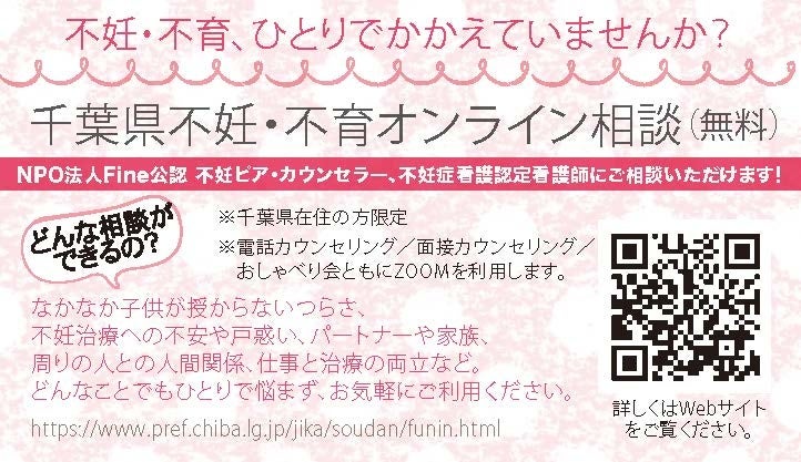 NPO法人Fineは、2004年から実施している不妊ピア・カウンセリング(*1)の活動実績が評価され、令和3年度に続き、『千葉県不妊・不育オンライン相談事業(*2)』を受託いたしました。