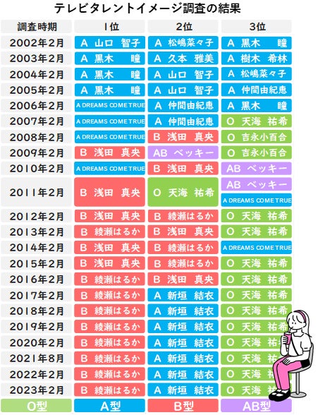 多くの調査が存在する中で、特に注目すべきは「テレビタレントイメージ調査」というもの。ビデオリサーチ社が年2回、2月と8月に実施しているこの調査は、既に100回以上の実績があります。そして、最近10年のデータを見ると、B型のタレントがほぼトップを独占しているのです。