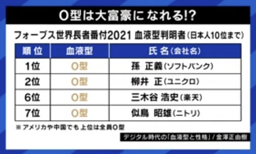 同様の内容が、2023年5月31日「知って得する血液型の最新情報SP」で取り上げられました。「O型はお金持ちの素質あり!?」ほか(データの紹介のみ)