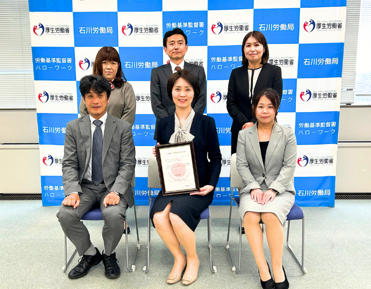 この認定は、女性活躍推進法に基づいた行動計画の策定・届け出を行った企業のうち、女性活躍推進に関する取り組みの実施状況が優良な企業を厚生労働大臣が認定する制度です。認定項目5項目のうち4項目の基準を満たし、2024年4月25日、2つ星(2段階目)に認定されました。同年5月21日に石川労働局にて認定通知書交付式が開催され、石川労働局長 八木 健一氏から認定通知書が授与されました。