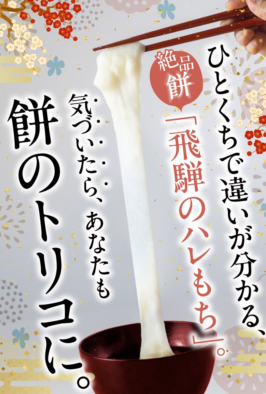 生粋のもち好きが美味しいと唸った飛騨の餅の美味しさをもっと多くの人に味わって欲しい!絹のように白く滑らかで甘みのあるつきたてのお餅を急速冷凍。年末・お正月はこのお餅でハレの日をお祝いしましょう!