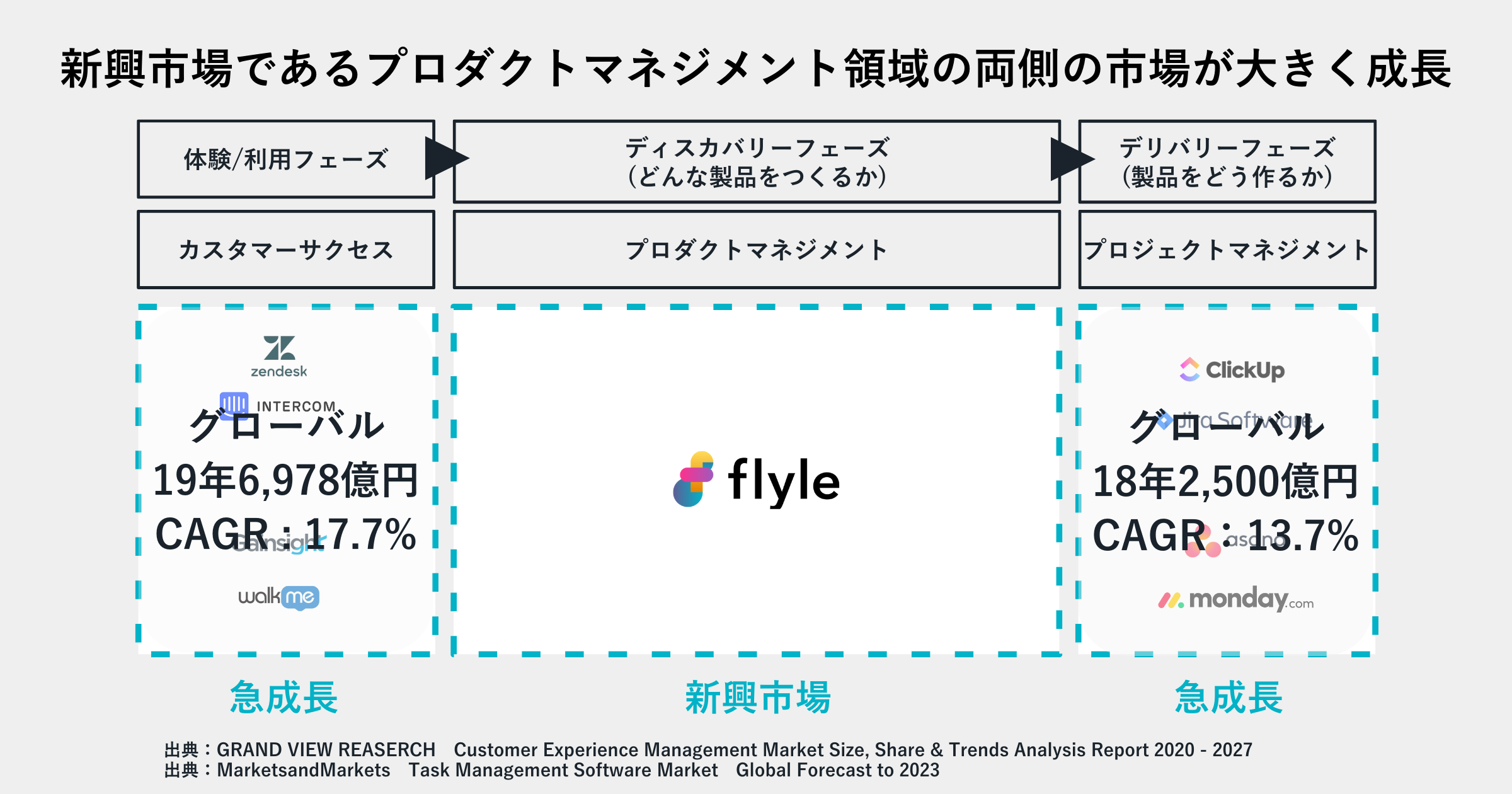 また、Flyleが位置する、プロダクトマネジメントソフトウェア領域は、バリューチェーンの両側の市場が大きく伸びており、今後の成長が予測されています。また、世界的に黎明期の市場ながら、米国、チェコ、イスラエルなど、各国から有力な企業が誕生しています。