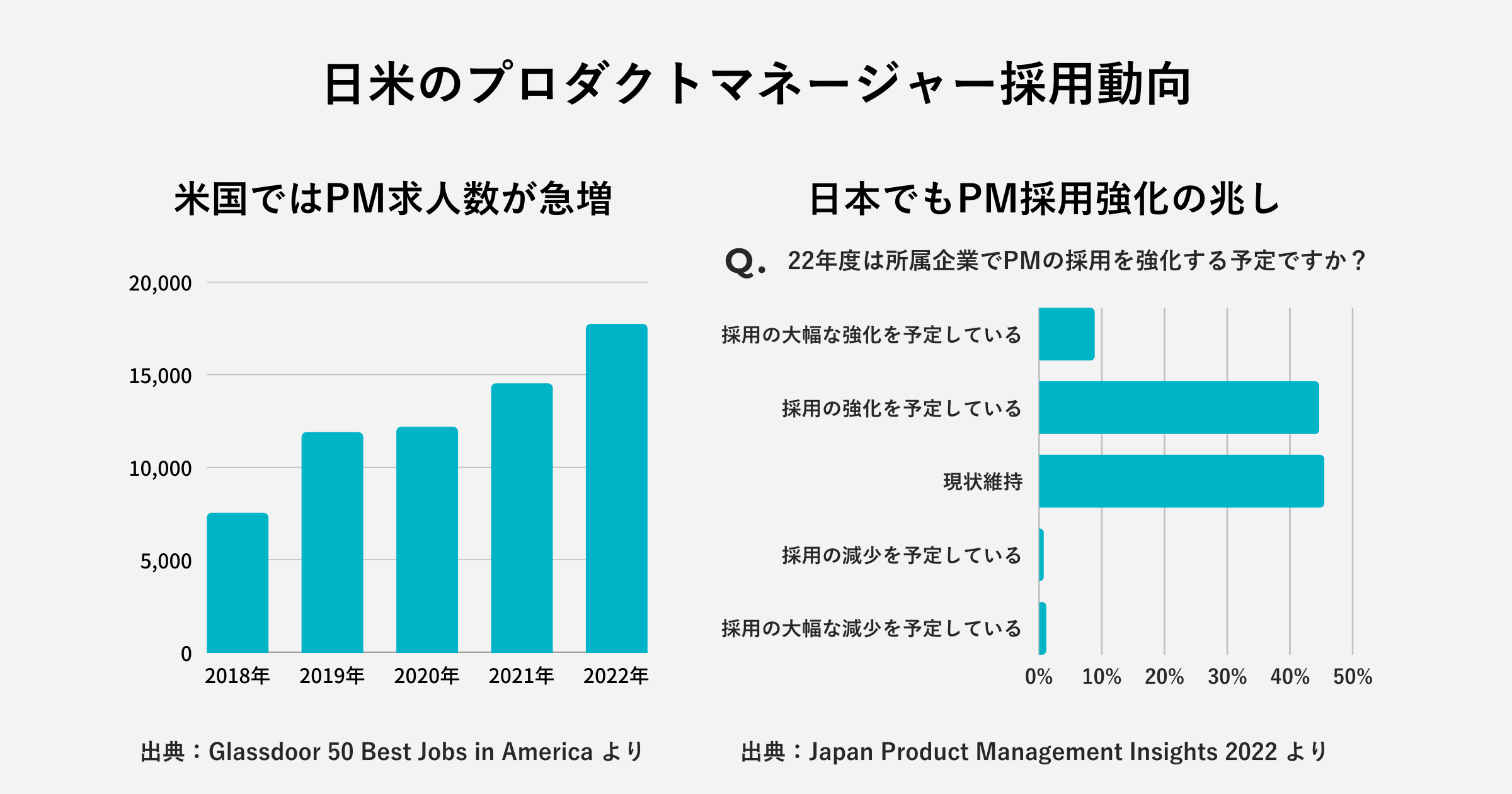プロダクトマネージャーの需要はここ数年でグローバルで急速に高まり、人気職種としての地位を不動にしています。米国大手求人サイトGlassdoorの50 Best Jobs in America for 2020年では21年は3位に、22年では10位にランクインしています。また、Glassdoor上のPM求人数も、2018年には7,531件だったものが、2022年までの5年間で17,725件まで急増しています。