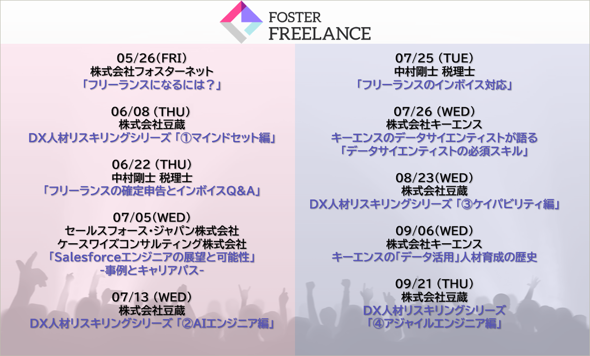 掲題の通り、弊社フォスターネットとグループ会社・パートナー企業様・顧客が連携し、ITフリーランスの方を対象に全10回のセミナーを実施致します。(一部法人企業向けのセミナーも含みます)