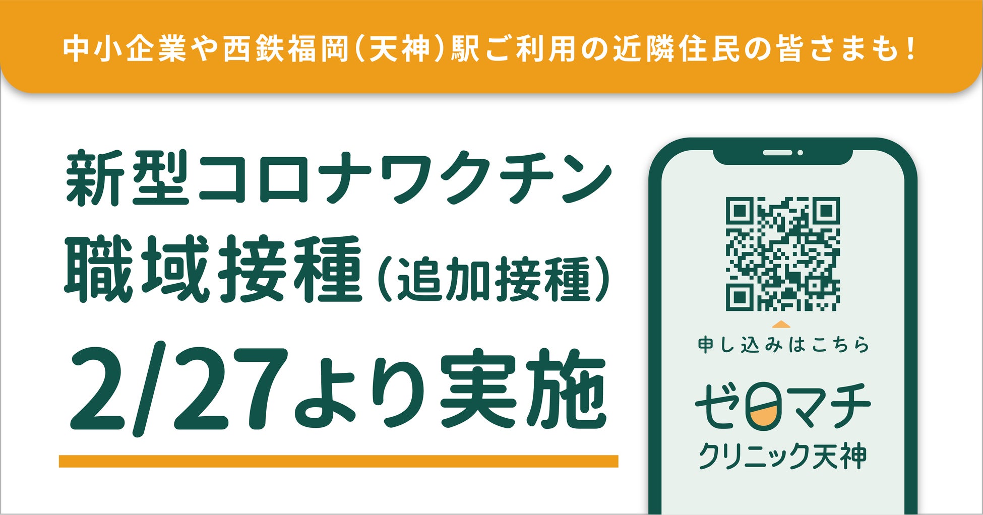 福岡市中央区天神のソラリアステージにあるゼロマチクリニック天神は新型コロナワクチンの職域接種(追加接種)を2月27日より行うこととし、同院の専用予約サイトで受付を開始しました。今回は前回合同実施した約70社の中小企業だけではなく、新規の申込み企業を募集するほか、クリニック付近の住民、あるいは西鉄福岡(天神)駅を中心とする天神エリアを利用する人からの申込みも可能です。新型コロナウイルス感染の拡大により、油断できない状況が続く中、同院は少しでも早く感染の拡がりが収束できることを願っています。