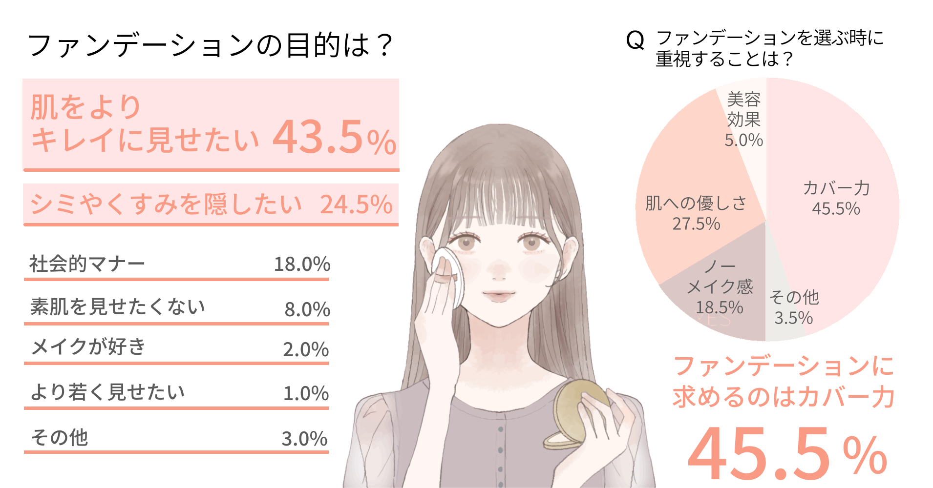 ファンデーションの目的の主流は「素肌をカバーしてより美しく見せるため」で、それがマナーであると捉えている女性は多いようです。