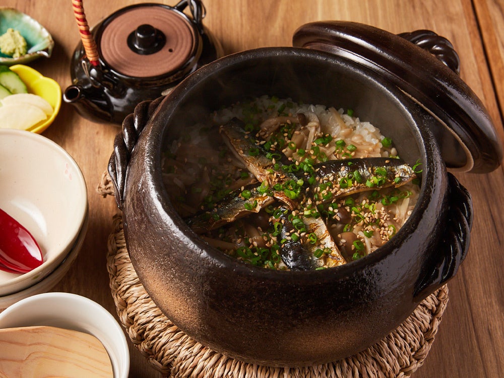 旬魚三種造り、魚の炉端焼き、丸ごと玉ねぎ炭火焼き、サンマと木の子の土鍋ご飯など。