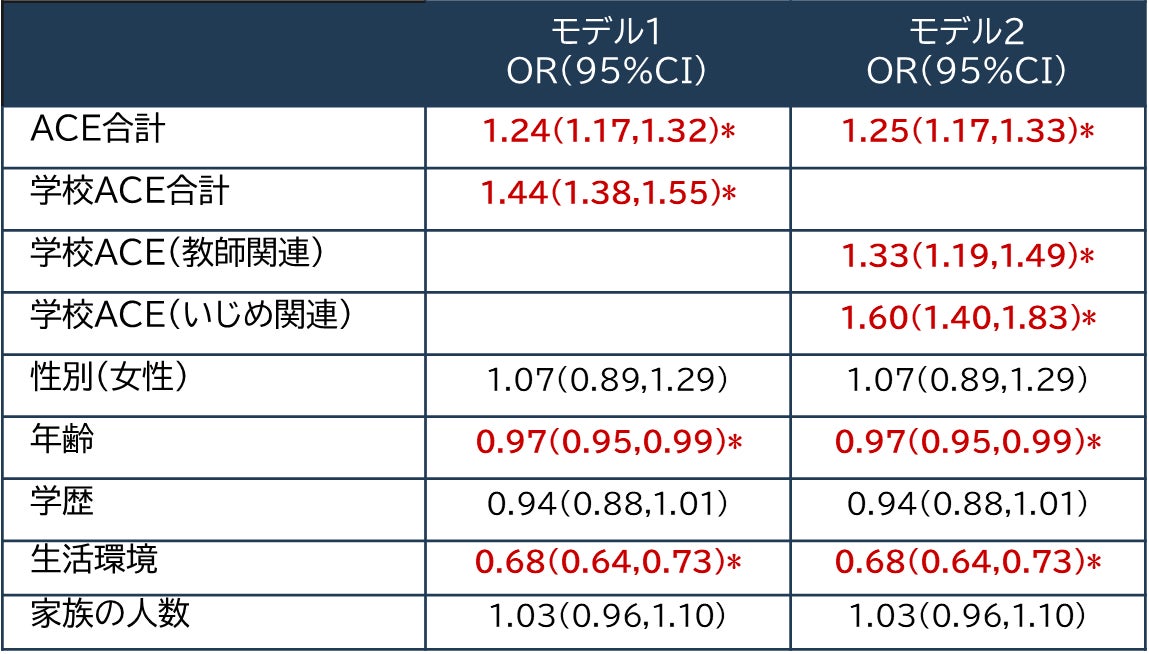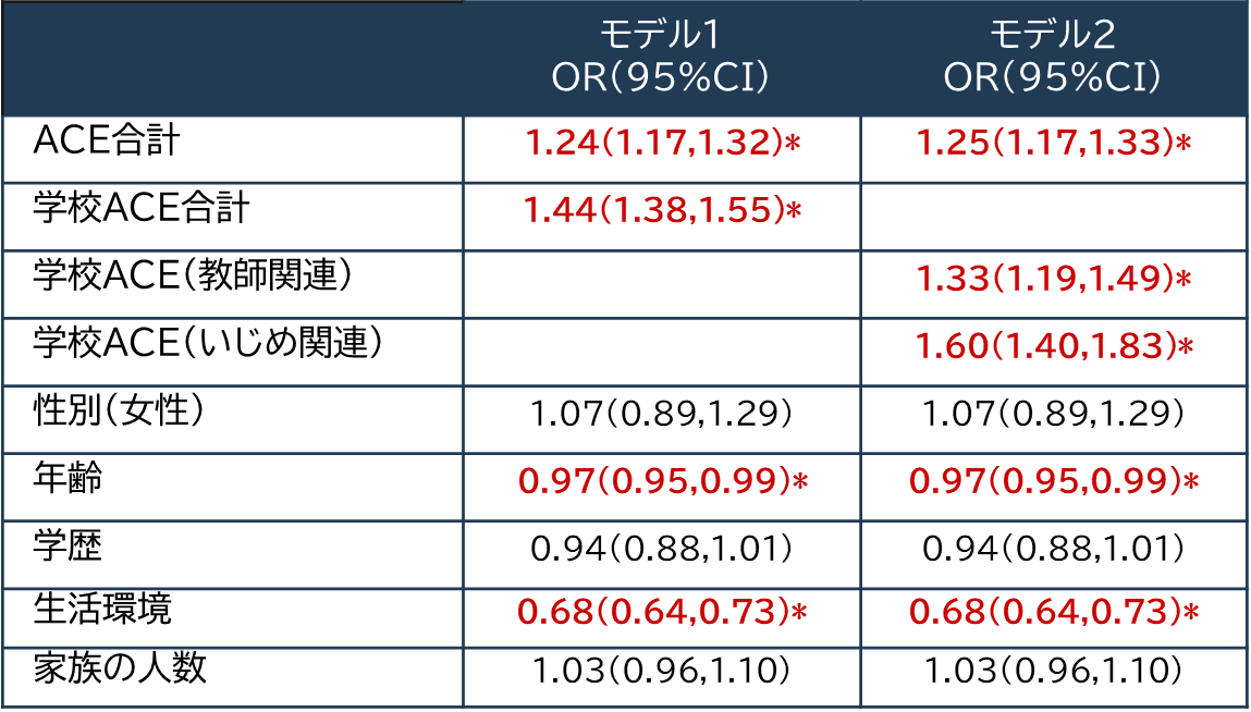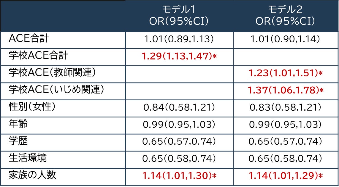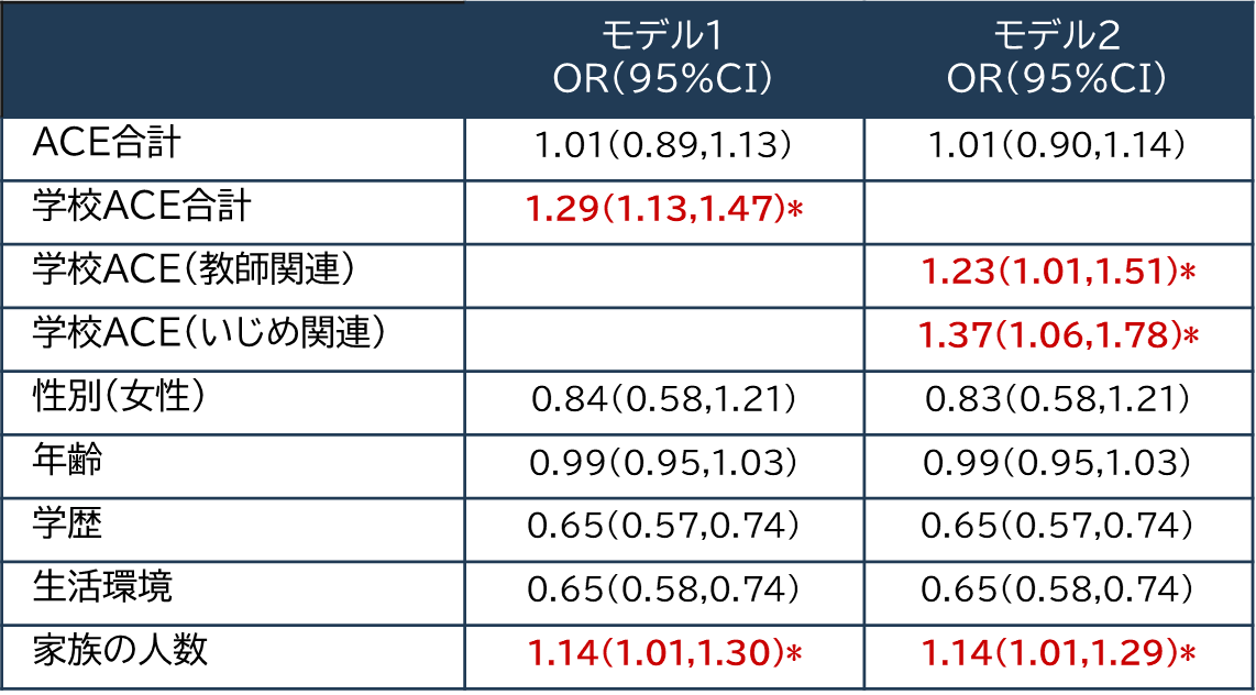 ※モデル1では、学校ACEを全体として扱い、モデル2は、学校ACEを教師関連スコアといじめ関連スコアに分けて扱っている。