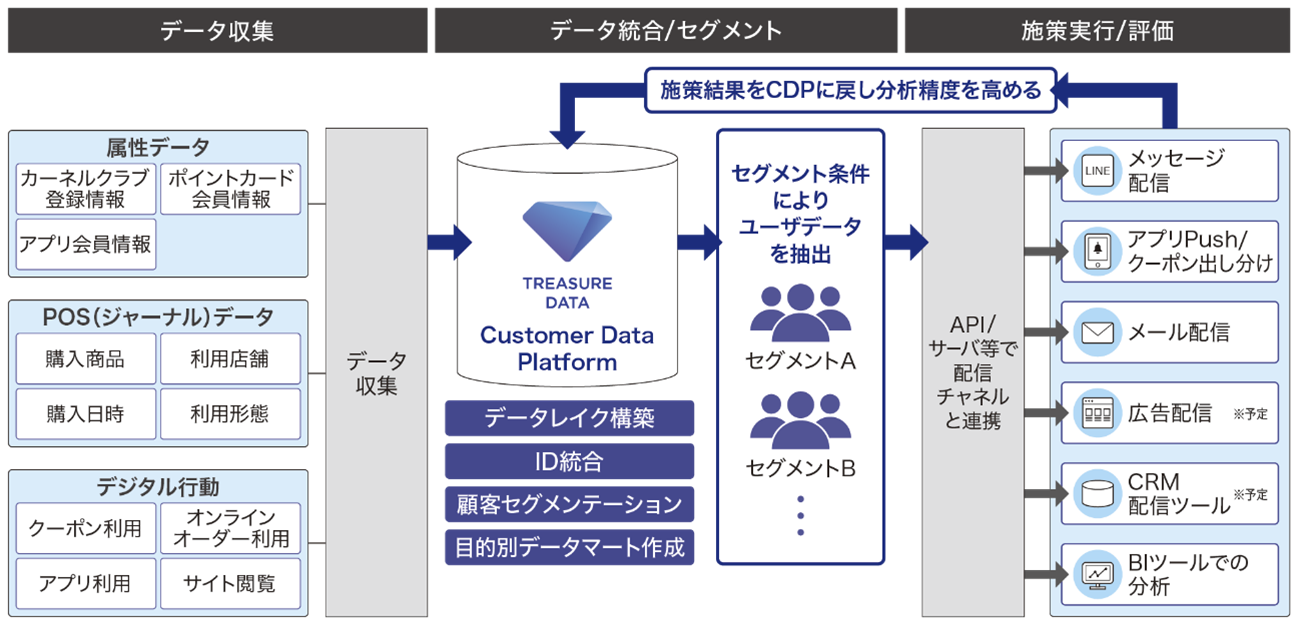 インキュデータは、トレジャーデータ株式会社(本社:東京都千代田区、代表取締役社長:三浦 喬)のカスタマーデータプラットフォーム「Treasure Data CDP」を活用し、日本KFCが有するユーザデータと購買データ、各チャネルデータといった各種データの統合と、各種配信システムなどの施策ツールへの連携を実現しました。日本KFCはユーザデータの分析・セグメンテーションを通じて、ユーザ一人一人の興味関心・購買意向に合わせたコミュニケーションの実施を目指します。今後、インキュデータは、日本KFCの高度なマーケティング施策の日常的な実行や、商品開発など、新領域でのデータ活用拡大に向けて継続して支援を行います。