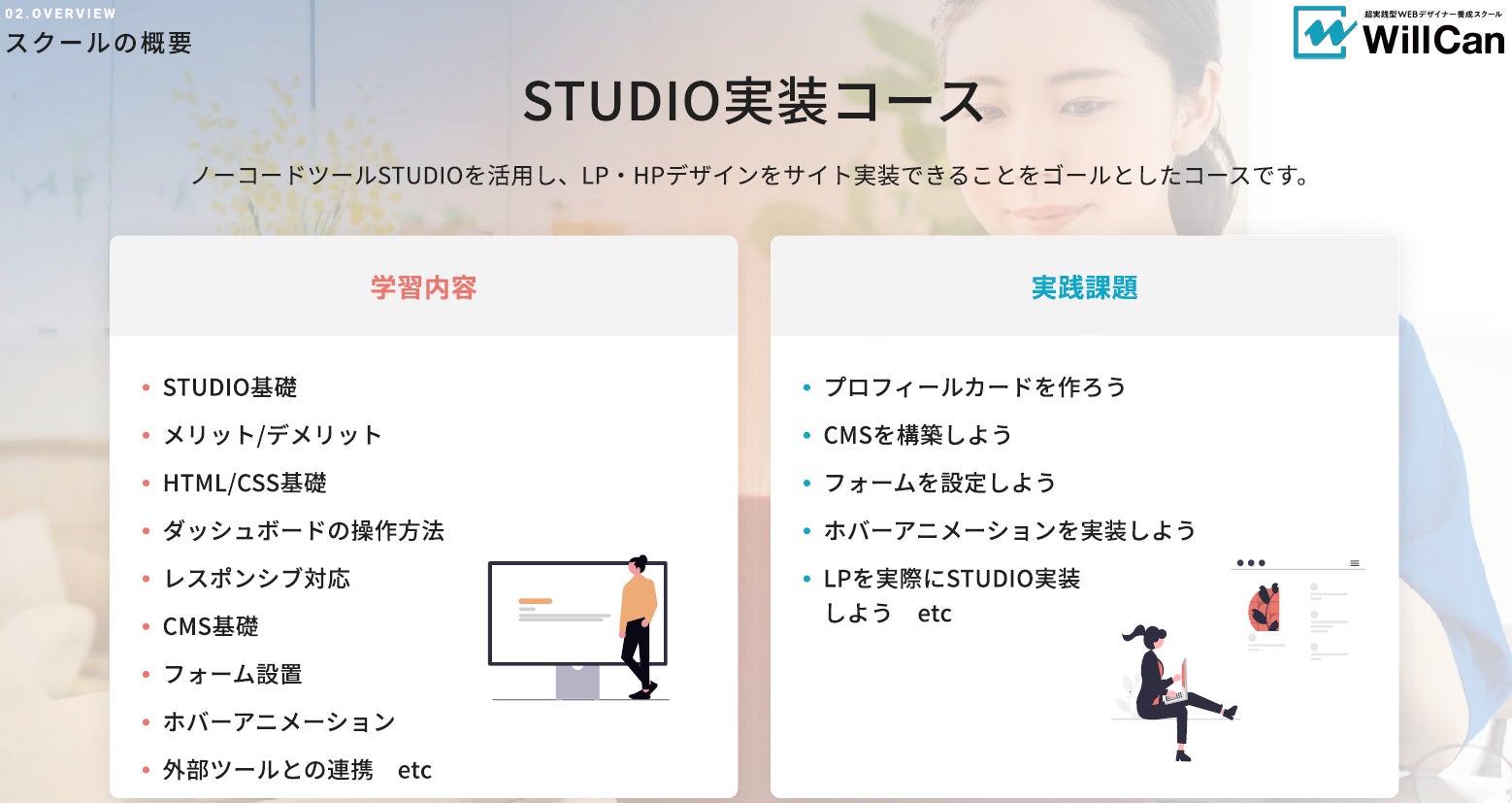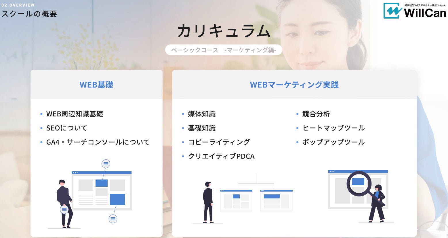 WillCanはWEBマーケティングの第一線で活躍するマーケターが監修し、 WEBデザイナーが身につけておくべきマーケティング知識・思考を網羅したカリキュラムをご提供いたします。