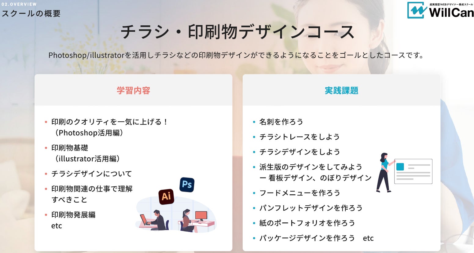 Photoshop・illustratorを活用し、印刷物の基礎知識から、チラシなどの印刷物デザインができるようになることを目標としたコースです。
