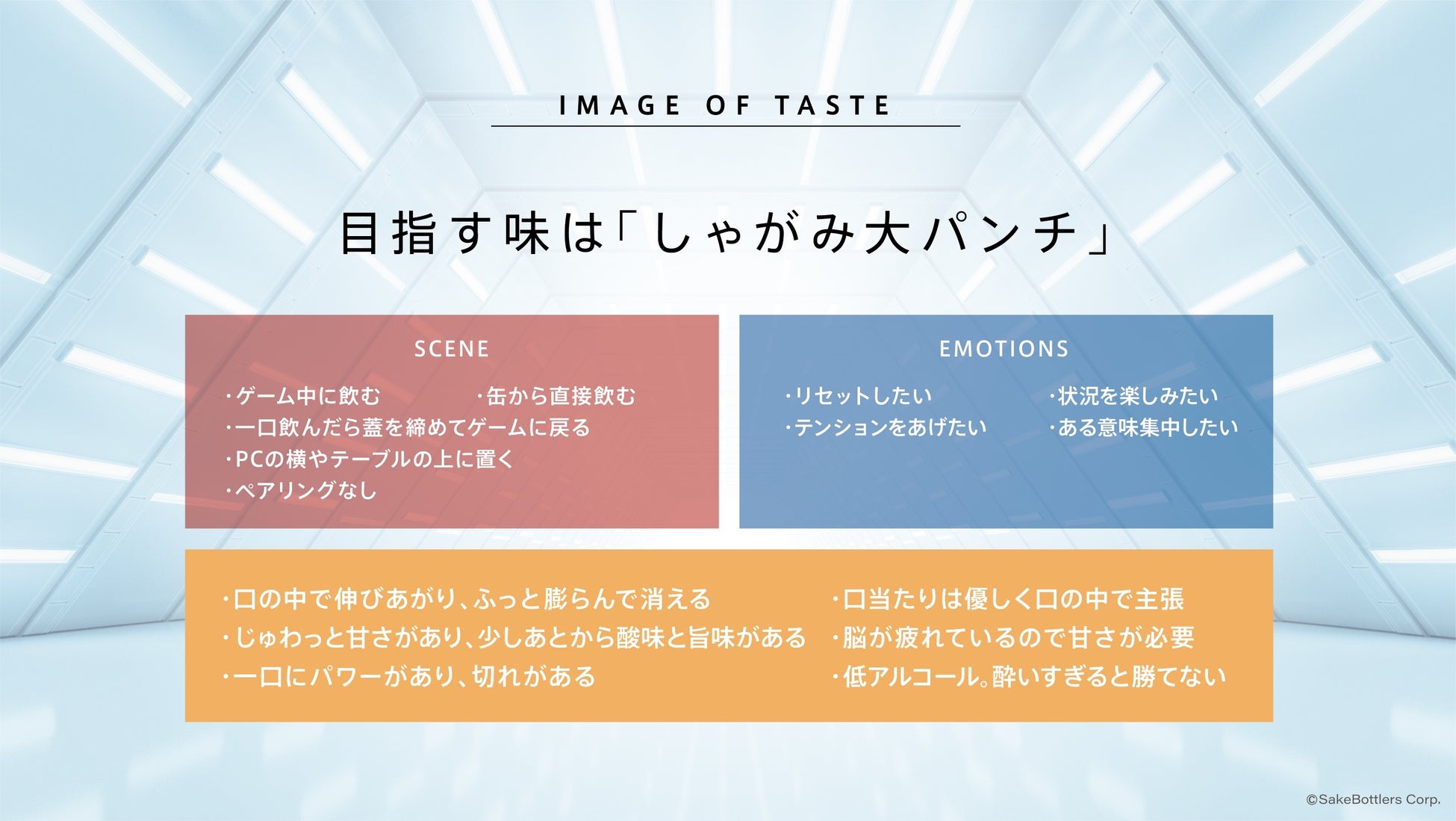 ゲーミング日本酒の味わいは、シーンや感情を日本酒の味に変換して検討した。
