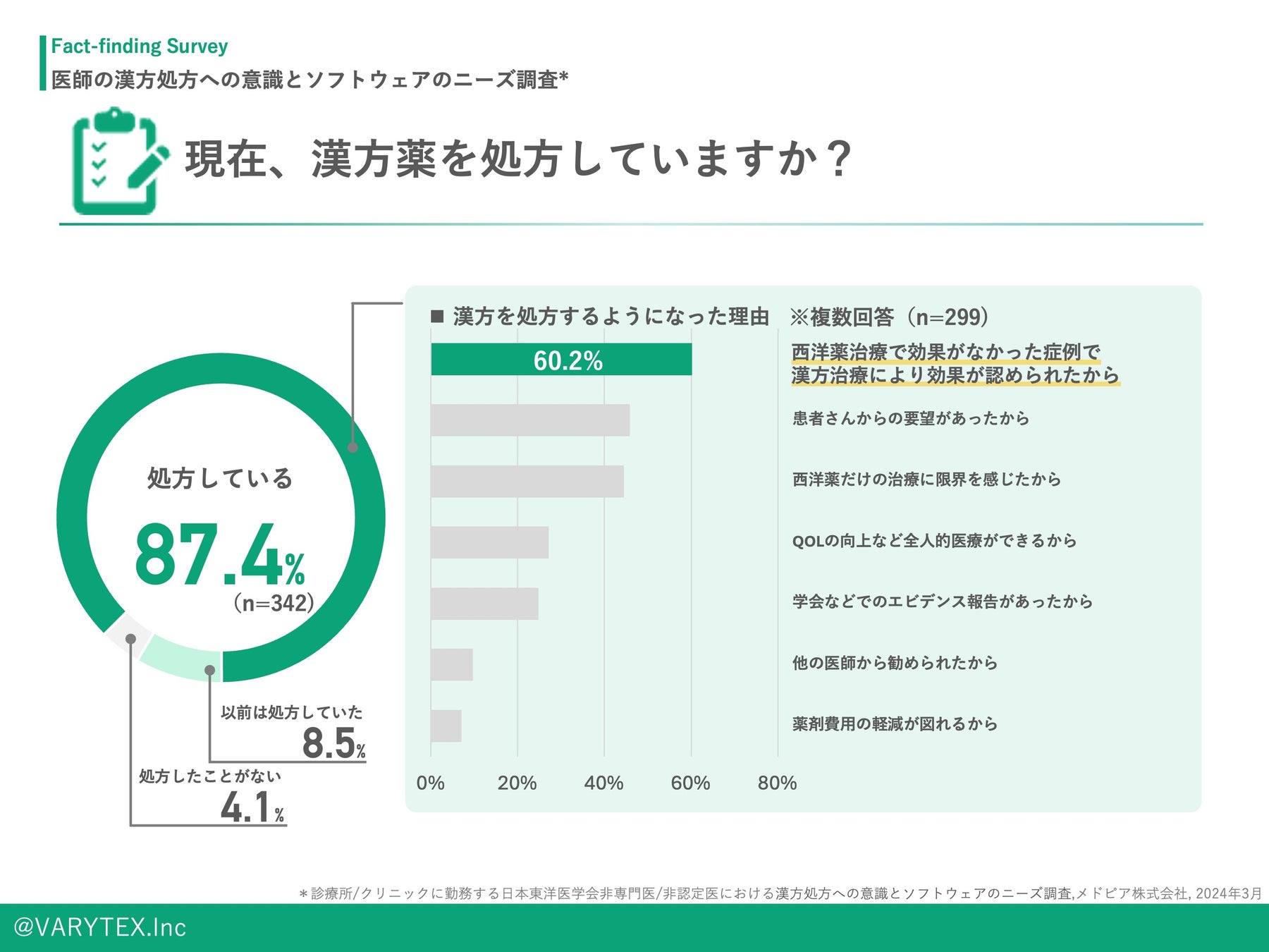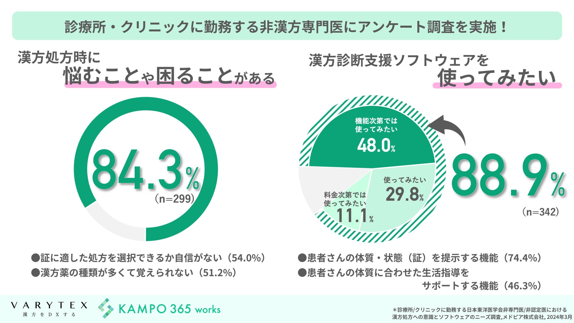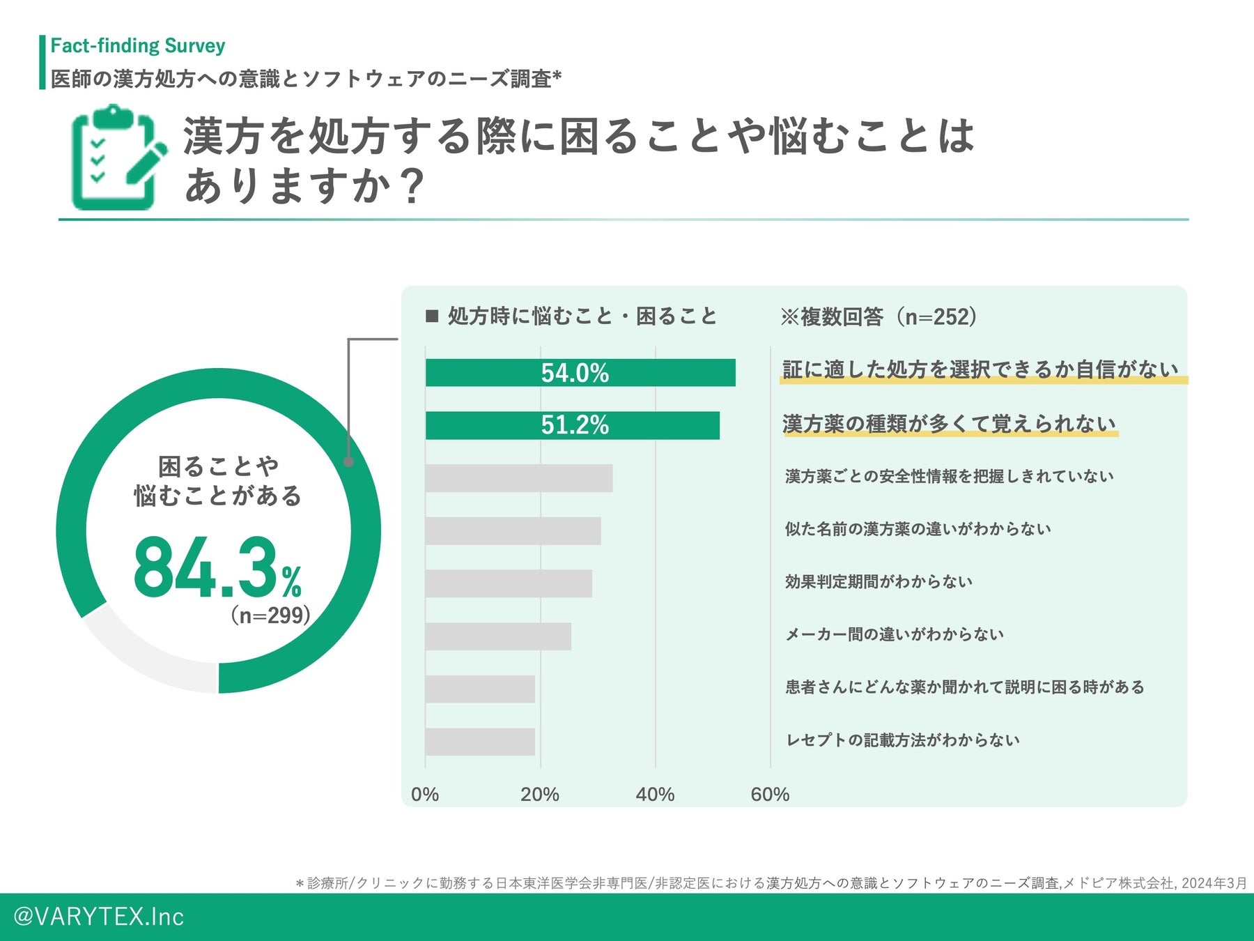VARYTEX(ヴァリテックス)株式会社(本社:東京都港区、代表取締役:平野喜一郎)は、非漢方専門医342名を対象に漢方処方実態調査を実施しました。非漢方専門医における漢方処方率は87.4%と、ほとんどの臨床医が漢方薬を使用しているにもかかわらず、そのうちの84.3%の医師は、患者の「証(しょう)」(漢方医学的体質・状態)に適した漢方薬を選択できるか自信がないなど、漢方処方時に悩むことや困ることがあると回答しました。また、漢方処方の課題を解決する手段として、漢方診断支援ソフトウェアなどの最新テクノロジーを使用したいという医師は88.9%と、非常に多くのニーズがあることがわかりました。