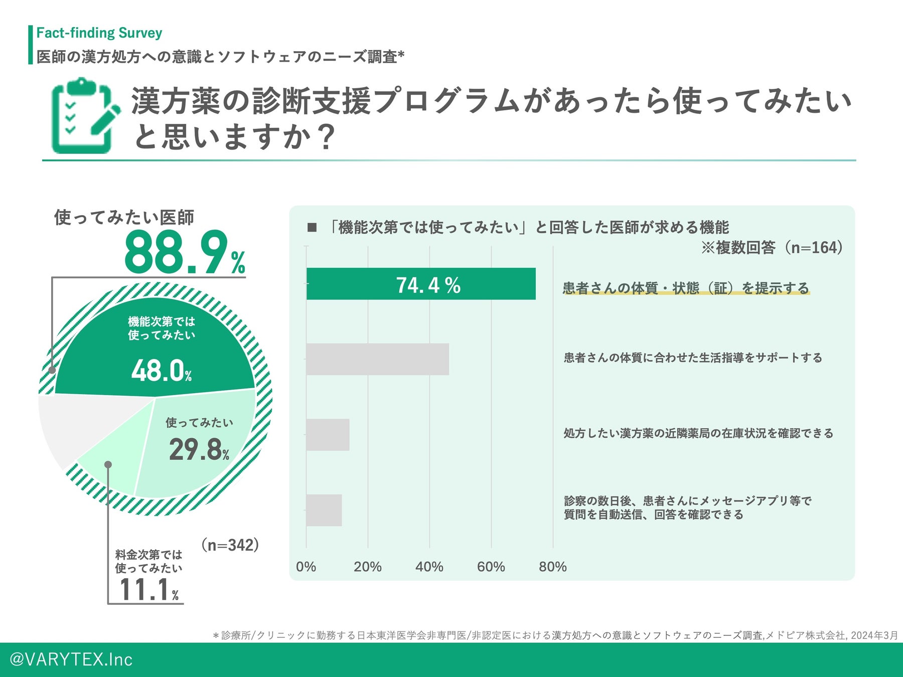 また現在の漢方処方の有無にかかわらず、患者さんの証に適した漢方薬を診断支援してくれるソフトウェアのニーズを確認したところ、「使ってみたい」と回答した医師は88.9%でした。「機能次第では使ってみたい」と回答した医師の74.4%が「患者さんの体質・状態(証)を提示する機能」を求めており、証にあった漢方薬を提示するソフトウェアに対する医師からの期待の高さが伺えました。