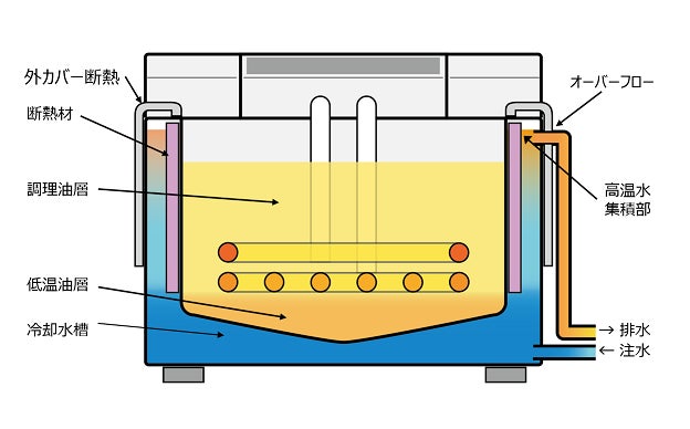 クールフライヤーは油槽の底部を水で覆い、ヒーター直下の油(低温油槽)を水冷する仕組みになっています。これにより、調理中に発生した水分や微細な揚げカスを低温である底部にすばやく落下沈殿させることが可能です(特許取得済)。