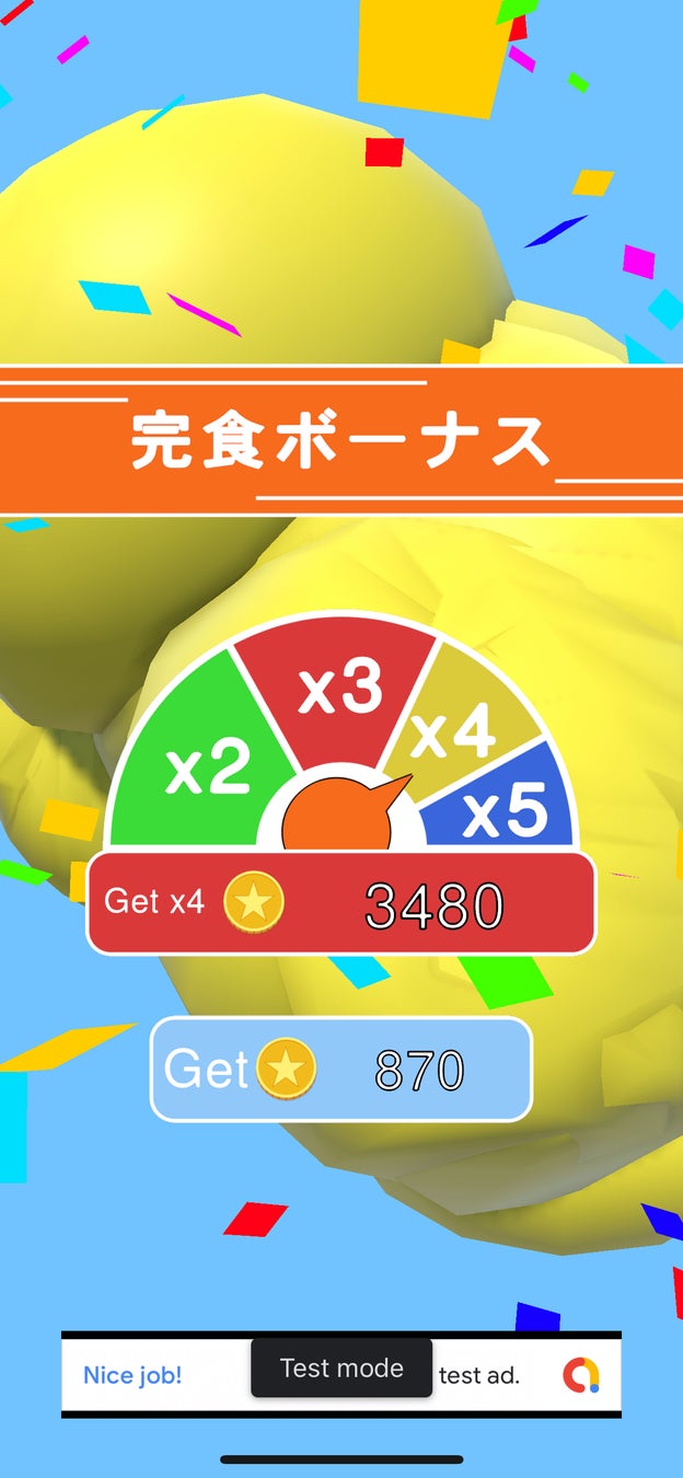 ゴール後、積み上げたハンバーガーを目の前のキャラに食べさせ成長させることによって、満足感や達成感を味わうことができます。集めた具材が多ければ多いほど、ゴール後のキャラも大きく成長します。