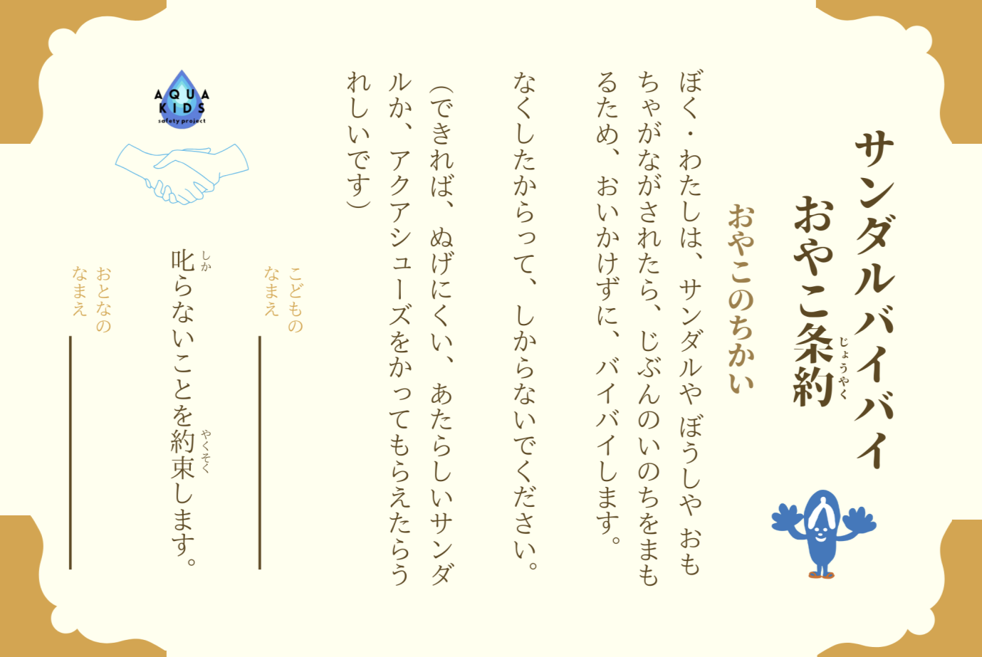 毎年、春先から増える水難事故。その中でも、流されたサンダルを追いかけたり、落としたモノを拾おうとして溺れる水難事故は、今月も既に起きており、中学生が亡くなっています。こうした事故を防ぐため、NPO法人AQUAkids safety projectでは、流されたものを追いかけないことを親子で約束する「サンダルバイバイおやこ条約証書」をリニューアルしました。新たな「サンダルバイバイおやこ条約証書」には、人気キャラクターのサンダルくんが登場。より親子で楽しく水難事故を予防できるようデザインを改良しました。