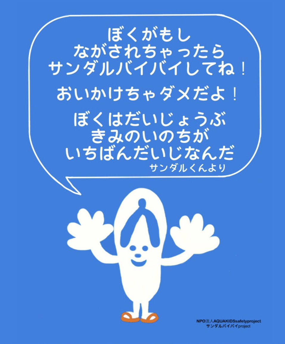 流されたサンダルなどを追いかけて溺れる⽔難事故を予防するキーワード。(流されたサンダルなどを 追いかけて溺れる⽔難事故は6年連続で発⽣しています。当法⼈調べ。)サンダルは買えても、命は買え ません。「流されたサンダルはバイバイしよう」サンダルバイバイには、これまでTwitter上で3000以上 のいいね!がつき、関連動画再⽣回数は10万回以上で、現在も更新中です。「流されたモノは追いかけない」という事故予防のアクションに、直接繋がりやすいキーワードとして、公⽴⼩学校の教材としても活⽤されています。