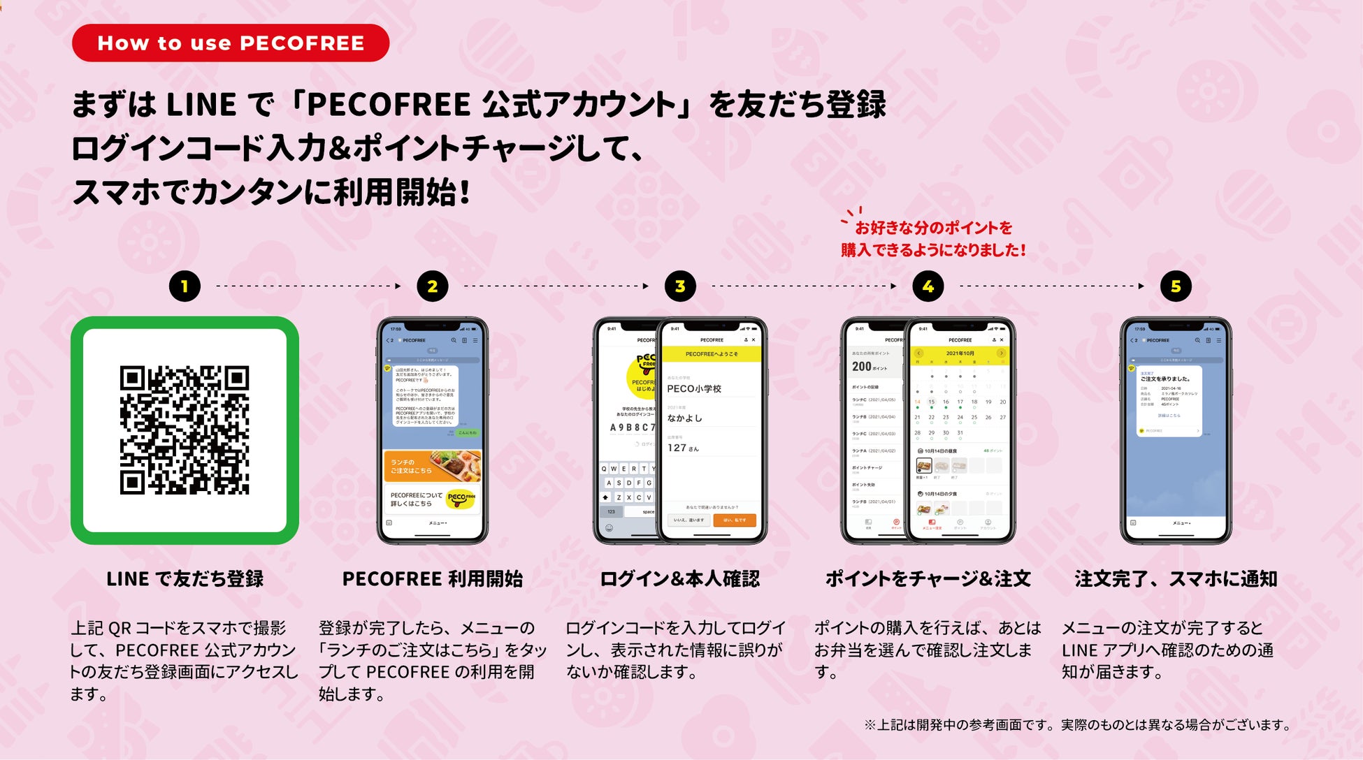 ペコフリーは施設単位の導入決定から開始できる。ペコフリーを利用したい日の栄養士監修のランチを注文期日までにLINE上のLINEミニアプリで予約注文すると、当日、施設に設置された受取り・返却BOXに弁当が配送されます。1食(弁当)あたり400〜500円(税込)で、保護者様がチャージしたポイントから支払われます。