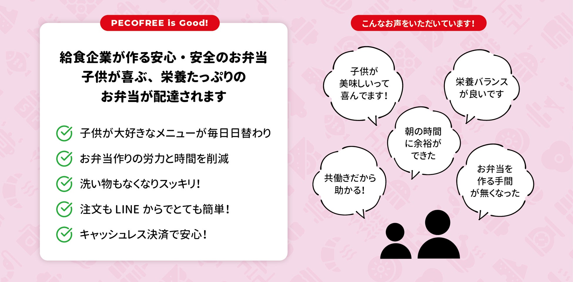 スマホから頼める【栄養士監修】お弁当サービス「PECOFREE(ペコフリー)」を2022年7月より、福岡県内の4市町学童保育所48施設、約3200名(春日市、那珂川市、太宰府市、新宮町)へ株式会社PECOFREEと株式会社テノ.サポートが連携し、サービスの提供を開始いたしました。共働き・ひとり親世帯が抱える夏休みのお昼ごはんづくり、学童保育所が抱えるお弁当発注取りまとめ業務を合わせてサポートいたします。今後も福岡市(学童保育所利用者数:17,492人 2022年4月20日時点)を始め、県内外(全国の学童保育施設登録児童数:134万8,275人 2021年厚生労働省調べ)へ向けてもサービスを拡充してまいります。