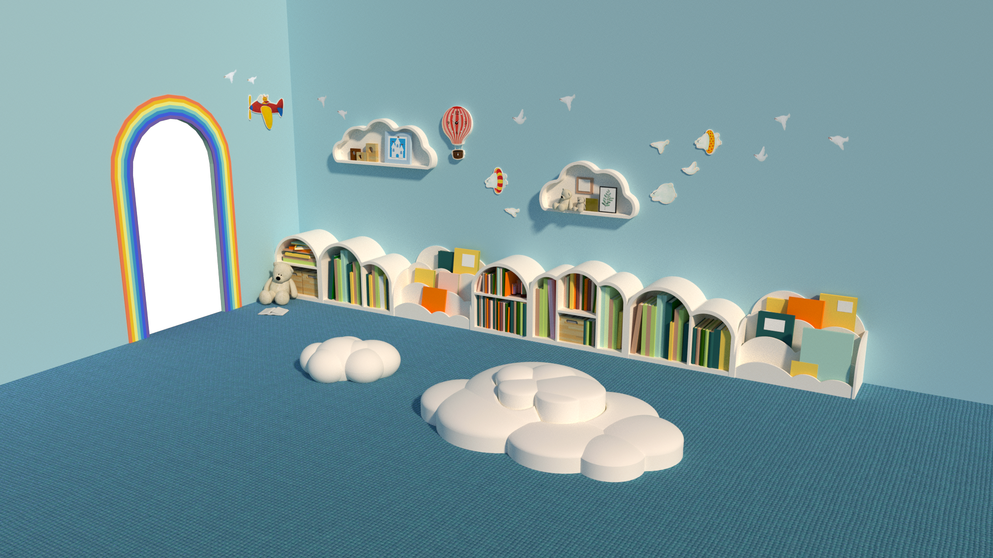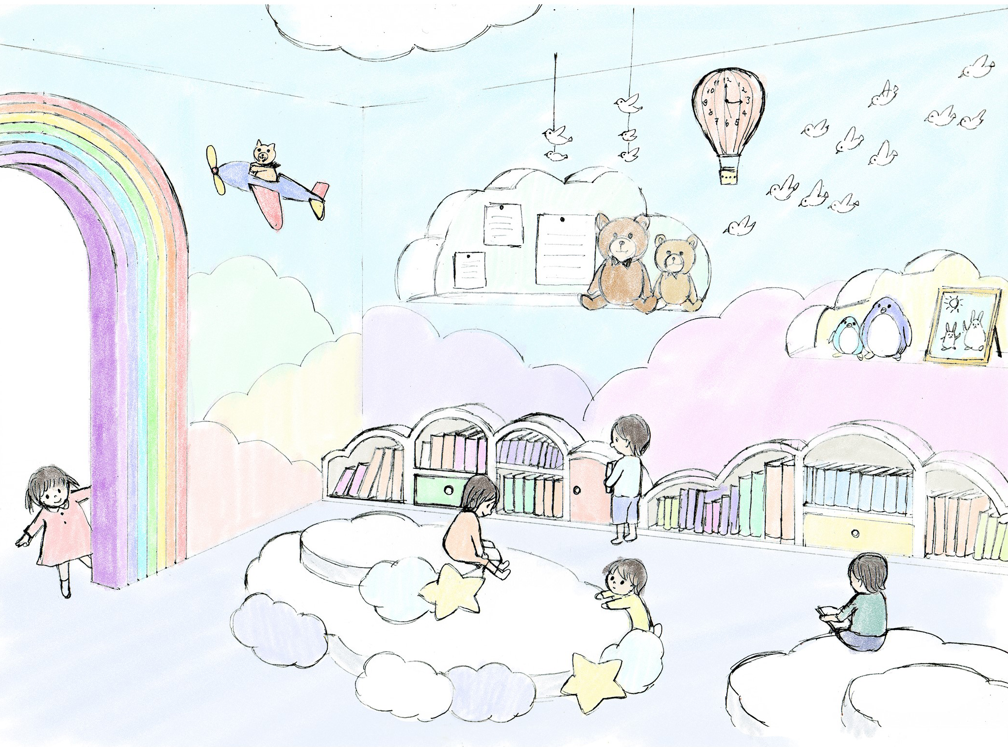 絵本作家として活躍する刀根 里衣氏が、「子どもたちの空想や想像が広がる、楽しい空間にしたい。」という思いを込め、空の世界をテーマにイメージを作成。まるで絵本のなかに入り込んだような、夢のある絵本空間が出来上がりました。