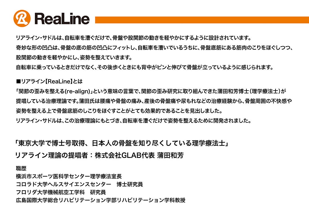 多数のトップアスリートが愛用する歪み対策の専門ブランド ReaLine(リアライン)リアライン。サドルを開発した蒲田博士は、リアライン理論の提唱者であり、各種のリアライン商品の発明者でもあります。このリアライン・サドルは、先行販売しているリューティ・ペリネライザーの特許(出願中)に基づき、自転車用の骨盤底筋トレーニング器具として開発されました。