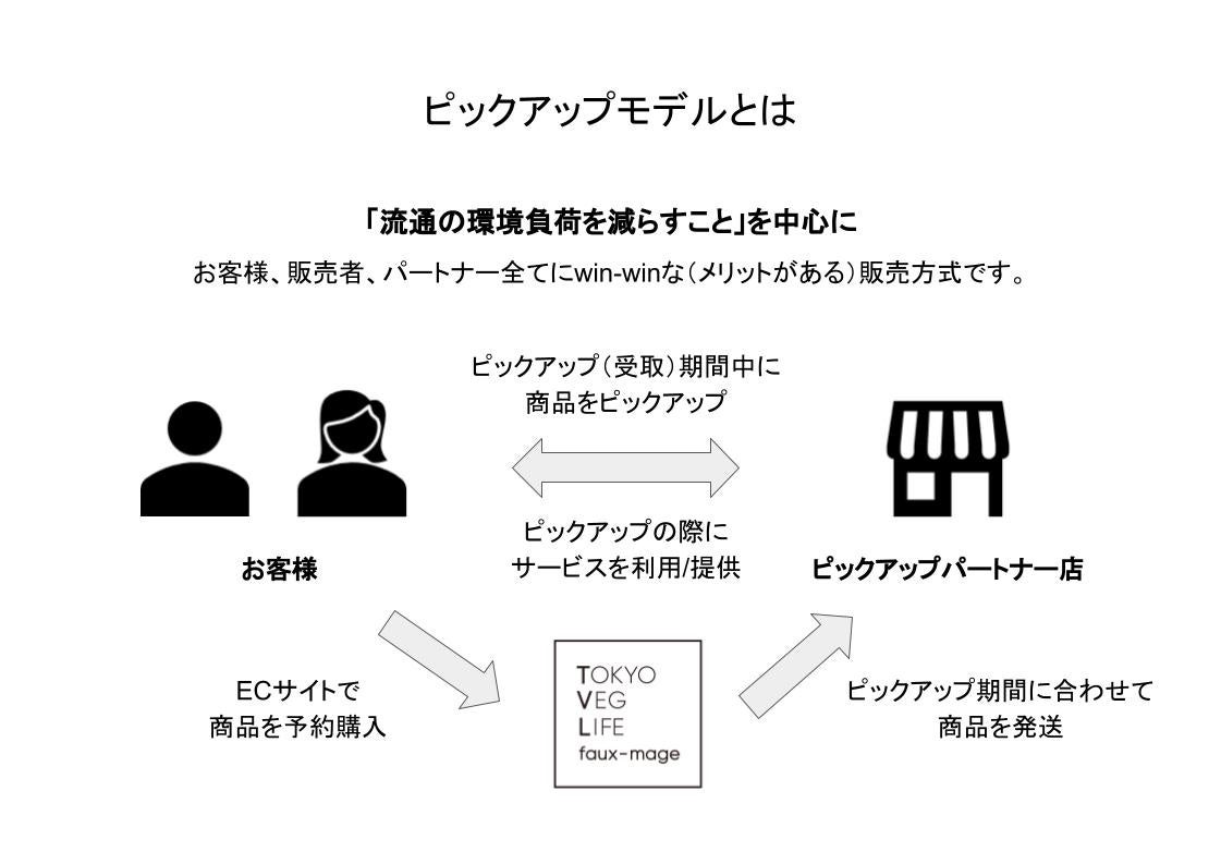 ピックアップ方式の販売では、お客様が、TOKYO VEG LIFE faux-mageのECサイトで商品を予約購入し、ピックアップ期間中に、指定のピックアップロケーション(飲食店・食料品店)で商品をピックアップ(受取)します。その際に、ピックアップロケーションでの飲食またはサービスの利用をしていただきます。