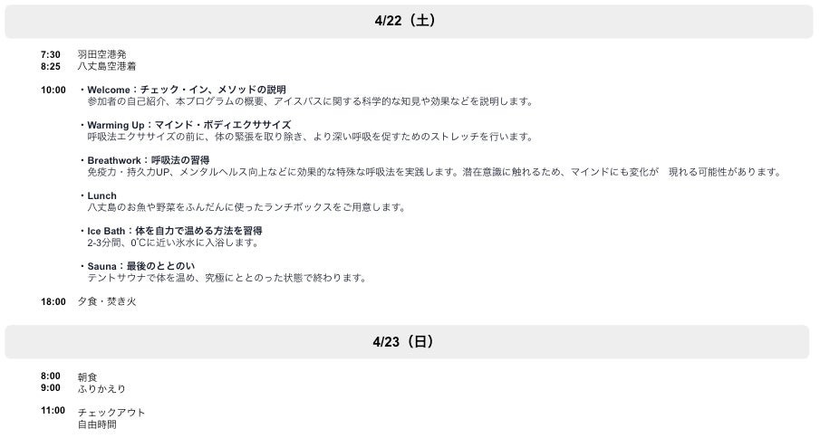 Island and office株式会社(本社:東京都世田谷区、代表取締役:須磨 一清、柏木 彩)と株式会社ヒューマンポテンシャルラボ(本社:神奈川県鎌倉市、代表取締役:山下 悠一、以下:ヒューマンポテンシャルラボ)は、2023年4月22〜23日、 八丈島にて「アイスバス &呼吸法プログラム」を実施いたします。