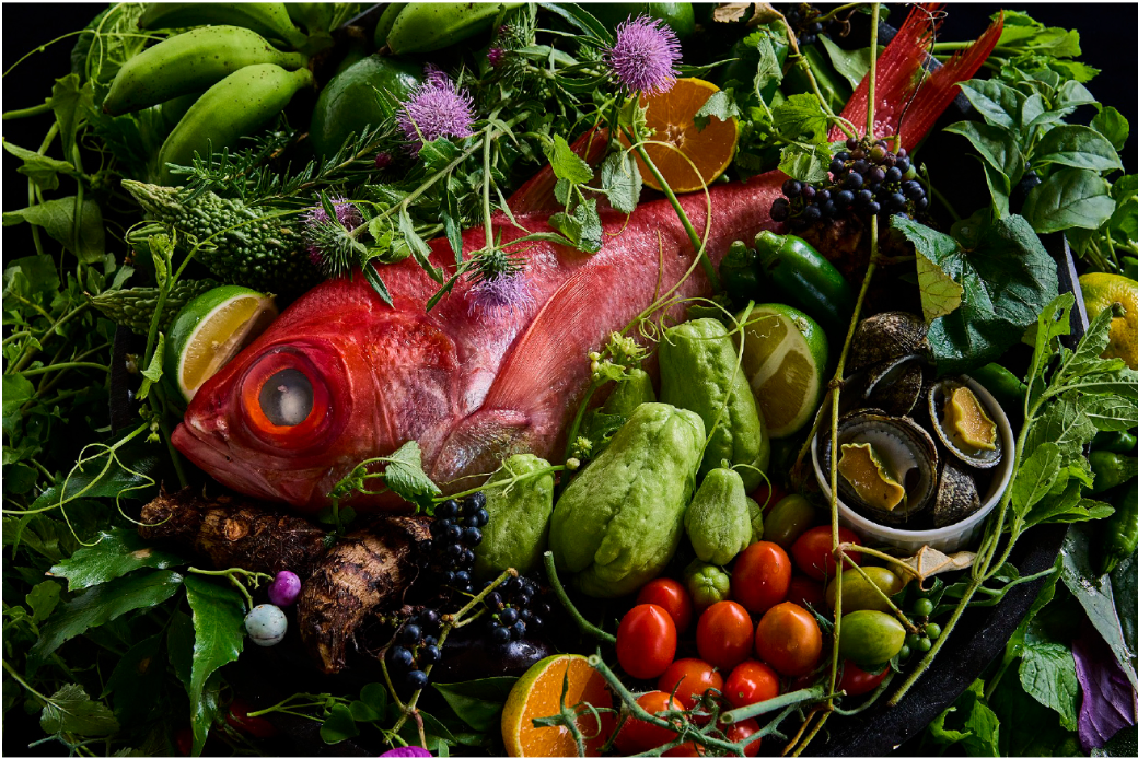 (2)八丈島で採れた魚や野菜を使った夕食・朝食を提供