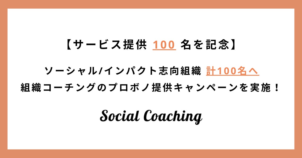 社会起業家特化型コーチングサービス Social Coaching 提供人数100名を記念して、ソーシャル/インパクト志向の「組織」を対象としたコーチングを100名へのプロボノキャンペーンを実施