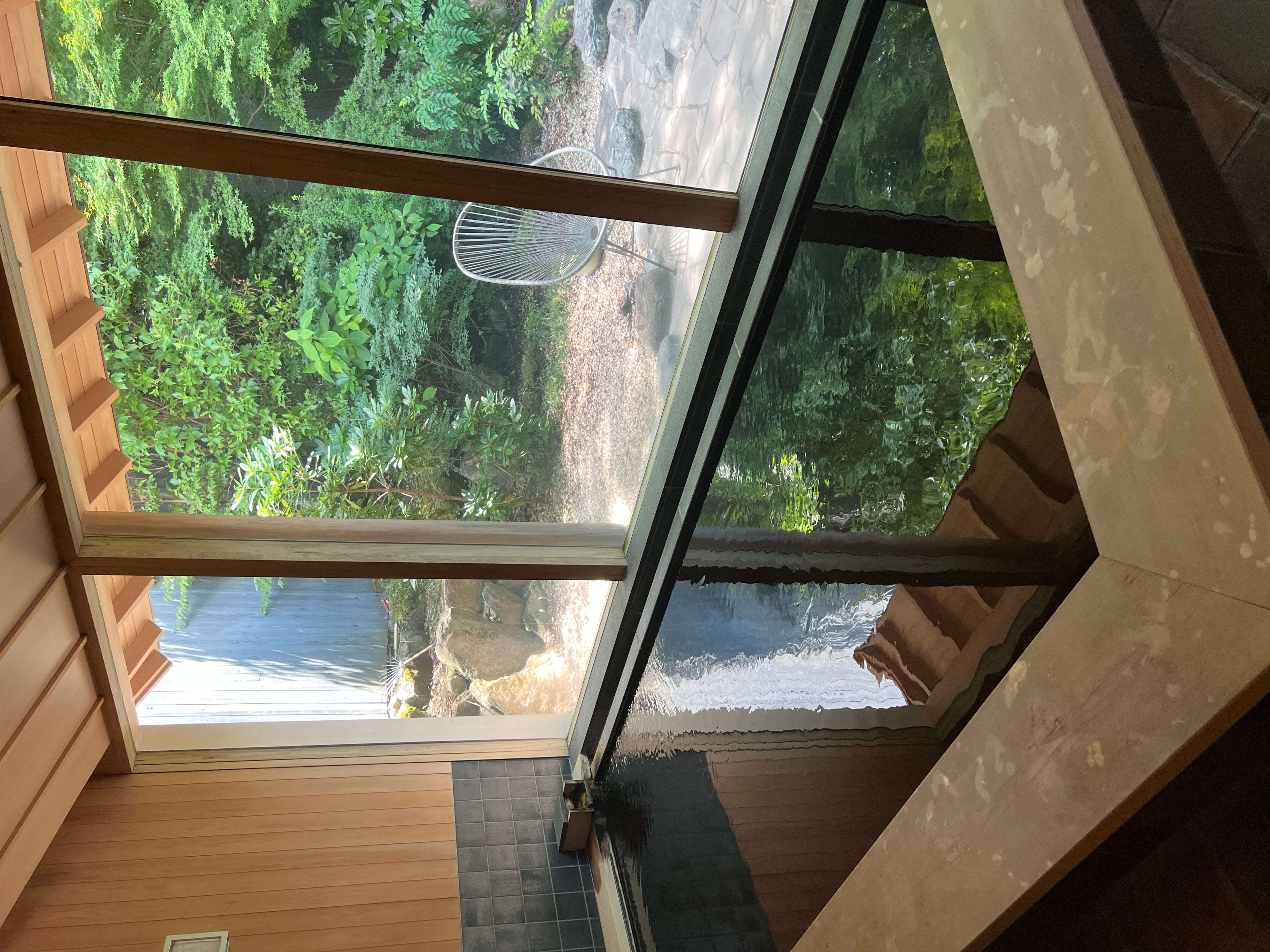 自然を感じながら浸かれる露天風呂とヒノキが香る大きなガラス窓の内風呂。