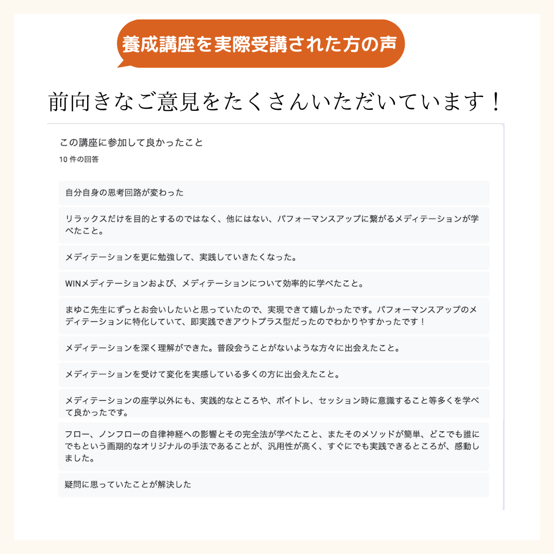 指導者になるための学びですが、それ以前に講師となる参加者お一人お一人の課題や悩みに寄り添い、WINメディテーション®︎を通じて成長する喜びをもっと実感してもらいたい! そう思いました。