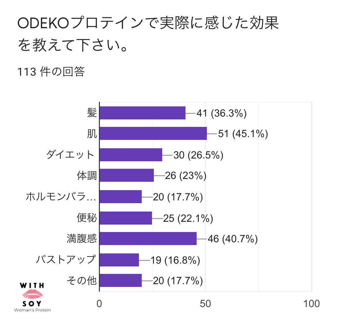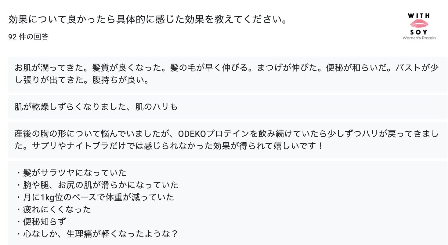 「美容専用ソイプロテイン"WITH SOY Woman's Protein」を開発した“脚やせYouTuber"川﨑 真菜美が代表を勤める株式会社ODEKOでは2022年2月、113名のご愛飲者さまにアンケートを実施しました。